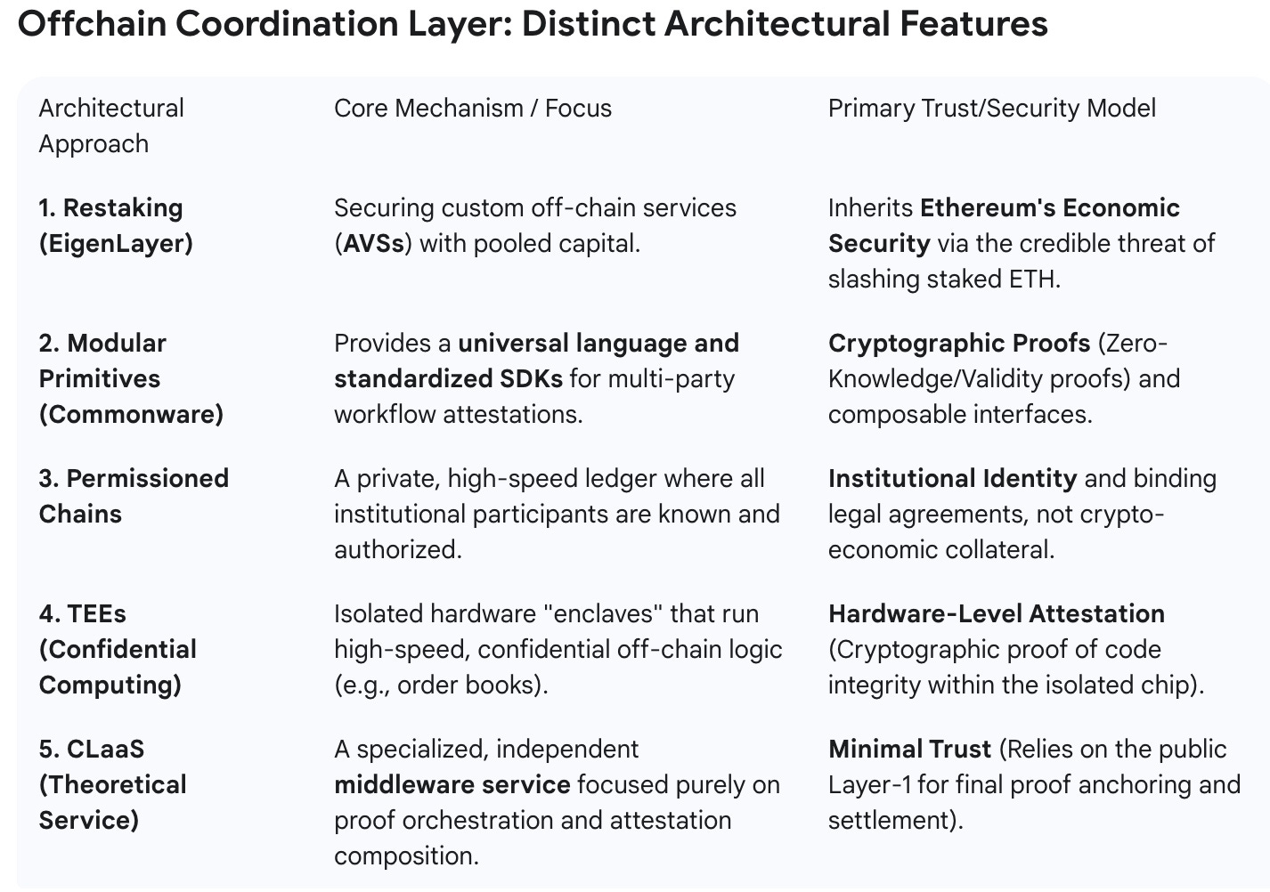 How it solves coordination: This theoretical fifth model could be seen as an extension of the Modular Frameworks, but delivered as a specialized, independent protocol. It is a service built upon the cryptographic and state machine primitives defined in Option 2. It would focus purely on the orchestration and attestation logic - the “middleware” - without operating its own full ledger or consensus mechanism. It would rely on the security of the public Layer-1 (like Ethereum) for final proof anchoring, the speed of rollups for settlement, and the legal and identity security of the participants (like banks and auditors) for the off-chain execution. This approach minimizes the trust assumptions in the new protocol itself, specializing only in composing proofs from disparate sources.