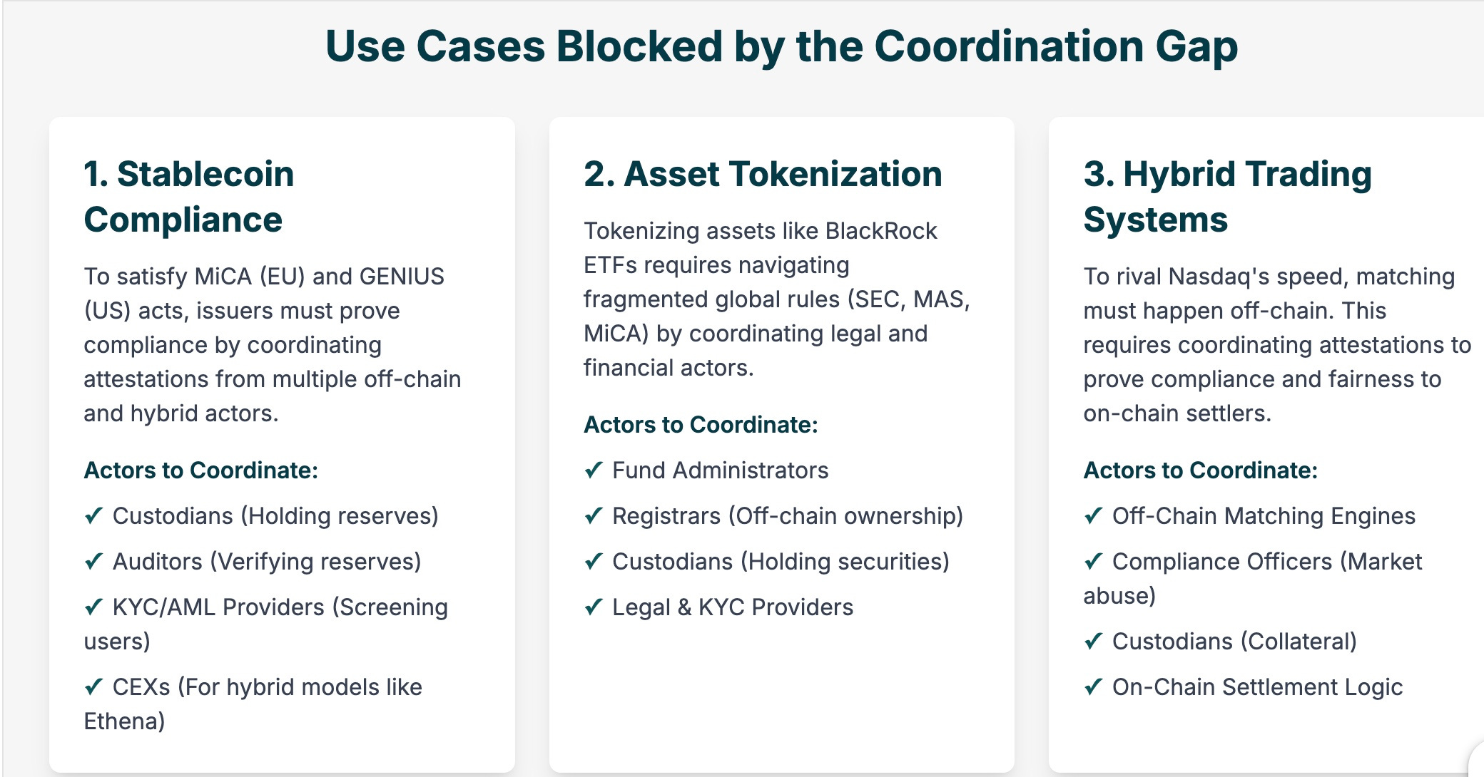 What’s Needed: A coordination layer that stitches together off-chain attestations (e.g., “Underlying assets secured; deed verified; KYC completed”) and on-chain actions (token minting, trading). This layer would use existing rollups for settlement and oracles for data, but add a new capability: Composing multi-party proofs that satisfy MiCA’s reserve rules or SEC’s investor restrictions. Execution happens off-chain for speed; proofs anchor on-chain for trust. This could tokenize billions in bonds and funds, creating liquid markets where illiquid assets once languished.