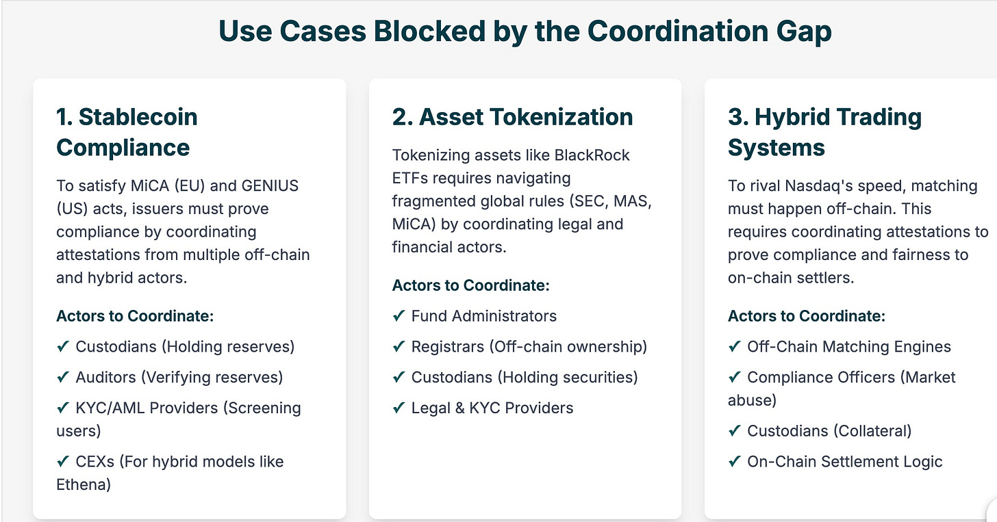 The coordination layer isn’t a new blockchain or protocol. It’s a framework to orchestrate off-chain and on-chain actions, leveraging existing infrastructure (Layer-1s, rollups, oracles) to prove compliance and alignment at scale. Think of it as the conductor for a financial symphony: It doesn’t replace the instruments (blockchains, oracles) but ensures every player - trader, bank, auditor - hits their cue, with proofs anchored on-chain. Let’s see this gap in action across three critical use cases.