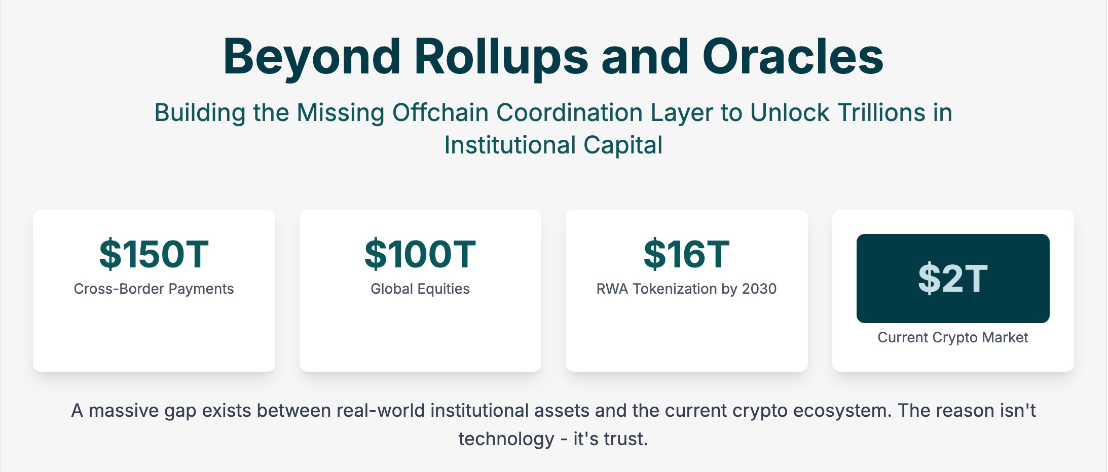 Why Existing Infra Fails: Oracles can fetch valuation data but can’t prove a custodian secured the asset or a registrar updated the off-chain ledger. Rollups can mint tokens but can’t orchestrate off-chain legal reviews or real-time KYC. Layer-1s are too costly for high-frequency investor checks. Without coordination, tokenization grinds to a halt: Developers cobble together bespoke integrations, custodians balk at unproven workflows, and regulators flag missing audit trails. The $10 trillion trade finance market - think letters of credit as smart contracts - faces the same wall.